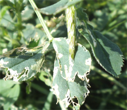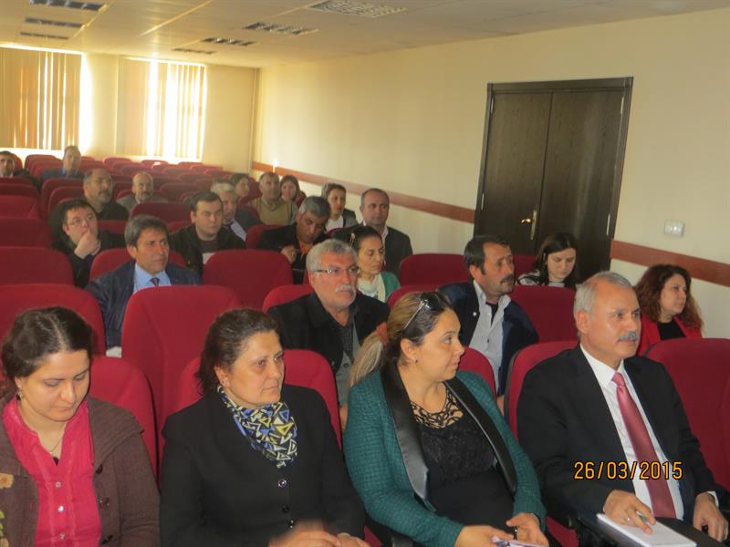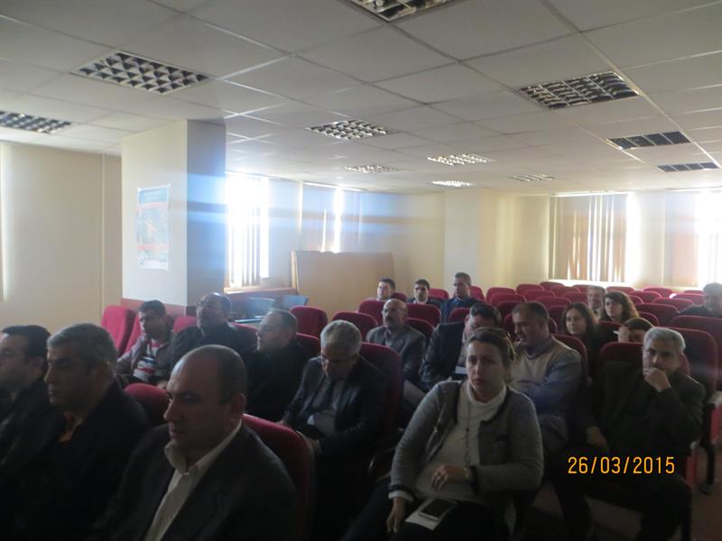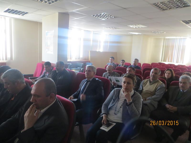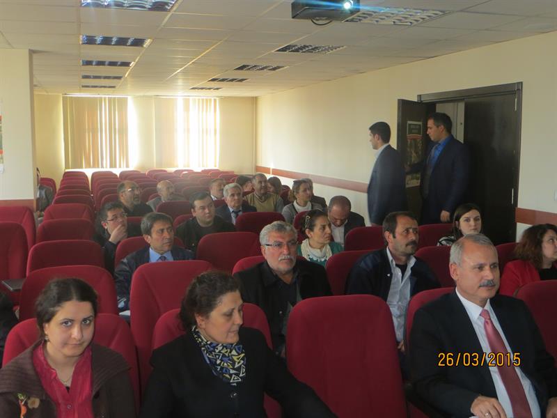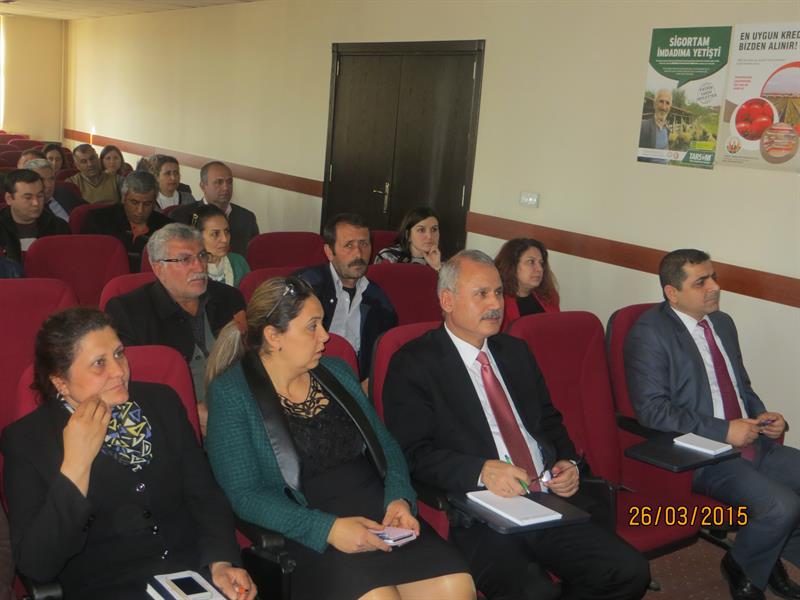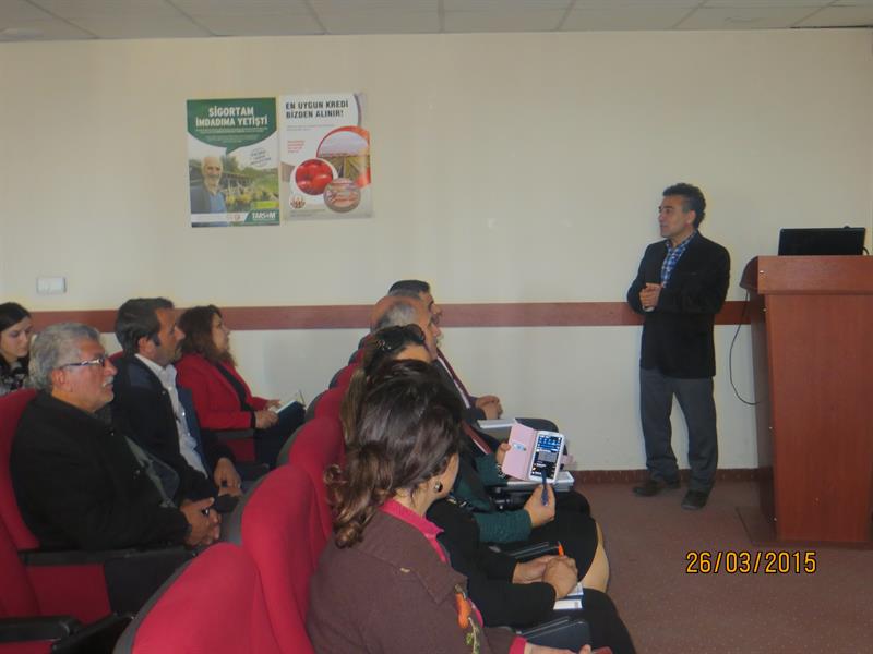İğdır İl Gıda, Tarım ve Hayvancılık Müdürlüğünün düzenlediği, yonca tarlalarında yoğun olarak görülen ve zararı fazla olan Yonca Hortumlu Böceği Mücadelesi, bu sorunu duyurmak ve bu konuda yapılan çalışmaları, üretilen çözüm önerilerini paylaşmak amacıyla 26.03.2015 tarihinde İl Gıda, Tarım ve Hayvancılık Müdürlüğü toplantı salonunda teknik personellere ve çiftçilere yönelik İğdır Üniversitesi Ziraat Fakültesinde görevli Yrd.Doç.Dr Celalettin GÖZÜAÇIK tarafından eğitim verildi. YONCA HORTUMLU BÖCEĞİ (Hyperapostica (Gyllenhal, 1813) Tamını: Erginler 5 - 6 mm uzunlukta olup kahverenginden griye kadar değişen renklerdedir. Baş küçük, petek gözlerden başlayarak uzamış ve hortum şeklini almıştır. Antenler dirsekli ve ucu topuzludur. Kanatlar bitişik dururken, bitişme hattında arkaya doğru daralan koyu renkli bir bant görünümü vardır. İlk bırakıldığında saydam, limon sarısı, açık sarı renkte olan yumurtalar ovaldir. 0.4 - 0.6 mm boyundadır. Açılıma yakın renk koyulaşır. Larvalar yeşil renkli ve baş siyahtır. Larva bacaksız olup sırtında uzunlamasına beyaz bir çizgi bulunur. Olgun larva 7-10 mm uzunluktadır. Toprak yüzeyindeki bitki artıkları, bitki dal ve yaprakları, yabancı otlar üzerinde ördüğü kokonlar içindeki pupa serbest pupa tipinde olup, ortalama 5.0 mm boyundadır. Yonca hortumlu böceği kışı, ergin halde, yonca tarlalarında veya kenarlarında bitki artıkları bitki kökleri civarında, toprak yarık ve çatlaklarında geçirir. İklime bağlı olarak mart ayının ikinci yarısından itibaren erginler tarlada görülmeye başlar. Yumurtalarını bitki fonolojisi ile ilgili olarak başlangıçta kuru saplar içinde, yeşil gövdelere, yaprak sapının bitki gövdesi ile birleştiği yerlere, yaprak saplarına ve sürgün uçlarına açtıkları delikten içeriye 1-29 adet olarak bırakırlar. Bir dişi ortalama 1100 yumurta bırakır. Yumurtalar 2-3 haftada açılır. Larvalar 2-3 gün sap içinde beslendikten sonra yaprak ve tepe tomurcuklarına dağılırlar. İlk 2 larva dönemini tomurcuk içlerinde beslenerek geçirirler, üçüncü ve dördüncü larva dönemlerinde bitki üzerinde açıkta beslenirler. Tarlada kokon içindeki ilk pupaların görülmesi mayıs ayı ortalarına rastlar. Yeni erginler yaz sıcaklıkları başına kadar beslenir. Daha sonra yazlamaya çekilirler. Sonbaharda tekrar hareketlenerek tarlalarda görülürler. Havaların soğumaya başlaması ile kışlamak üzere toprağa girerler. Yılda bir döl verirler. Yaşayışı ve zararı: Ergin zararı, larva zararına göre daha az olup, erginler genellikle yaprağın orta damarı hariç yan damarları, yaprak ayasını ve sürgün uçlarını yerler. Larva zararı önemlidir. İlk iki dönem larvalar sürgün uçları ve yaprak koltukları arasında beslenirler. Tomurcuk ve sürgün ucu yediklerinden bitki gelişmesi yavaşlar. Son iki dönem larva yaprakları dıştan kemirerek yer, sadece orta damar veya yan damarlar kalır. |
